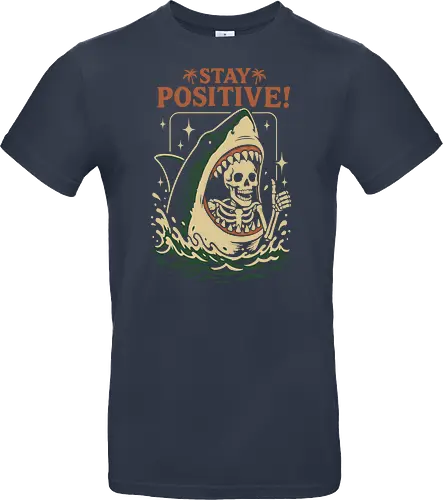 Ein Hai, aus dem ein Skelett hervorragt, grinst mit einem gezwungenen Lächeln, begleitet von der Botschaft „Stay Positive“ oben. Ein Design mit unverschämt schwarzem Humor, perfekt für Zyniker, Fans dunkler Ästhetik und alle, die lieber über Chaos lachen.