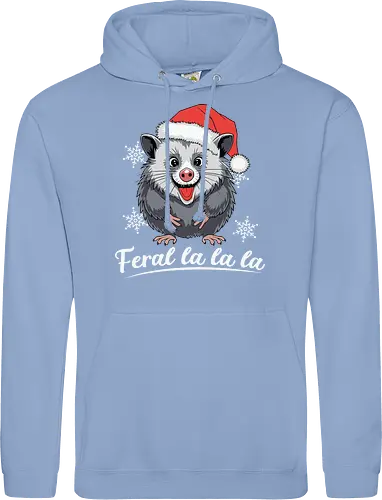 A cheerful possum wearing a Santa hat graces the center of the design, surrounded by snowflakes. The phrase "Feral la la la la" is playfully written below.