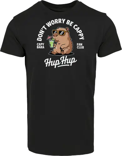 A capybara wearing sunglasses is enjoying a drink with an umbrella in it, surrounded by playful text. The design promotes a carefree attitude with phrases like "Don't Worry Be Cappy" and "Hup Hup."
