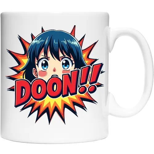 A cartoon character with blue hair and wide eyes is surrounded by a burst design featuring the word "DOON!!" in bold letters., emphasizing the colorful explosion effect.