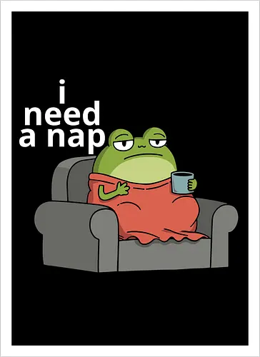 This humorous design features a very relatable grumpy frog, wrapped cozily in a red blanket and sitting in an armchair, holding a steaming mug. The text "i need a nap" perfectly captures the frog's tired expression, making this a perfect statement piece for anyone feeling sleepy, overworked, or simply in need of some serious rest. Ideal for those who appreciate witty animal humor and comfortable vibes, this design is a charming way to express your mood.