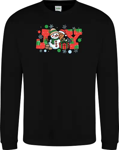 A cheerful snowman and a gingerbread person stand next to a large red "JOY" sign adorned with snowflakes and surrounded by holiday decorations. Gift boxes and festive ornaments add to the seasonal theme.