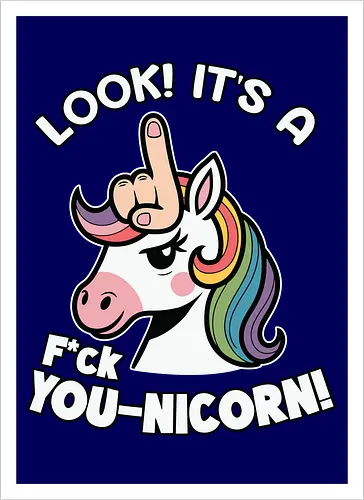 A whimsical unicorn with a rainbow mane displays a cheeky expression while holding up a hand in a playful gesture. Surrounding the unicorn are bold, humorous text elements that add a comedic twist.