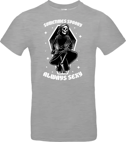 This awesome, cool, and funny t-shirt is perfect for those who love Halloween, eerie pieces, frightening art, creepy skeletons, and the spooky season. It features a ghost reaper skeleton dancing in a sensual way, with the quote "sometimes spooky, always sexy".