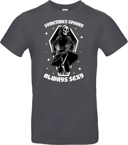 This awesome, cool, and funny t-shirt is perfect for those who love Halloween, eerie pieces, frightening art, creepy skeletons, and the spooky season. It features a ghost reaper skeleton dancing in a sensual way, with the quote "sometimes spooky, always sexy".