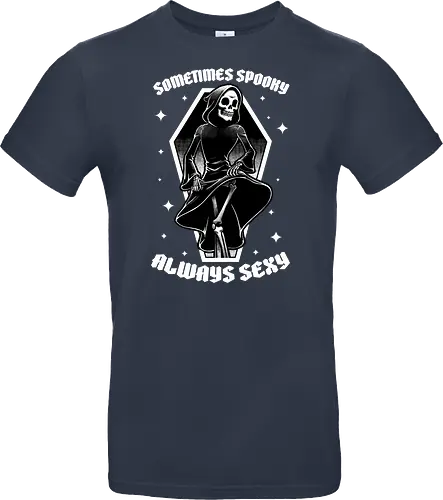 This awesome, cool, and funny t-shirt is perfect for those who love Halloween, eerie pieces, frightening art, creepy skeletons, and the spooky season. It features a ghost reaper skeleton dancing in a sensual way, with the quote "sometimes spooky, always sexy".
