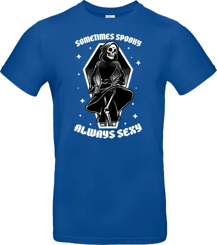 This awesome, cool, and funny t-shirt is perfect for those who love Halloween, eerie pieces, frightening art, creepy skeletons, and the spooky season. It features a ghost reaper skeleton dancing in a sensual way, with the quote "sometimes spooky, always sexy".