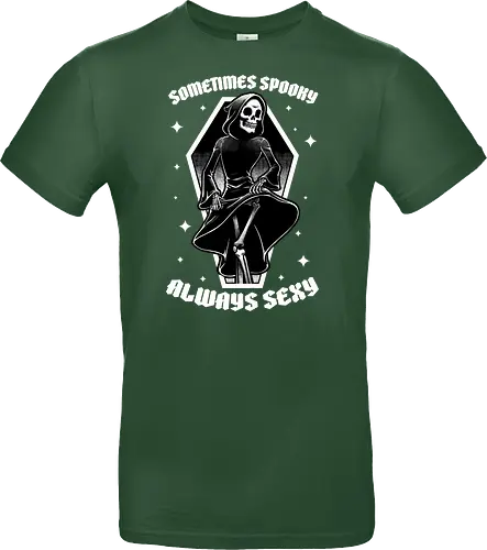 This awesome, cool, and funny t-shirt is perfect for those who love Halloween, eerie pieces, frightening art, creepy skeletons, and the spooky season. It features a ghost reaper skeleton dancing in a sensual way, with the quote "sometimes spooky, always sexy".