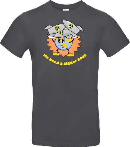 Diese satirische Retro-Cartoon-Erde ächzt unter dem Gewicht von Raketen und erklärt humorvoll: "Wir brauchen ein größeres Boot." Witzig, nachdenklich und schmerzhaft nachvollziehbar!