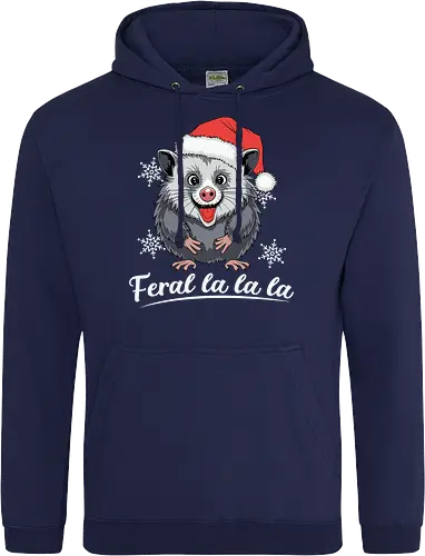 A cheerful possum wearing a Santa hat graces the center of the design, surrounded by snowflakes. The phrase "Feral la la la la" is playfully written below.