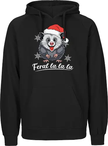 A cheerful possum wearing a Santa hat graces the center of the design, surrounded by snowflakes. The phrase "Feral la la la la" is playfully written below.