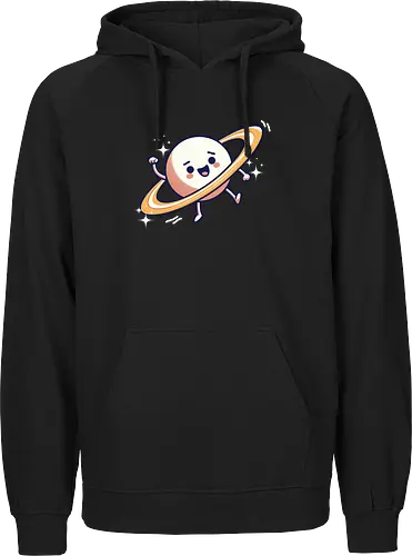 A cute cartoon planet with a ring is waving happily, surrounded by bright stars. The planet has a smiling face and is depicted with small, playful arms and legs.