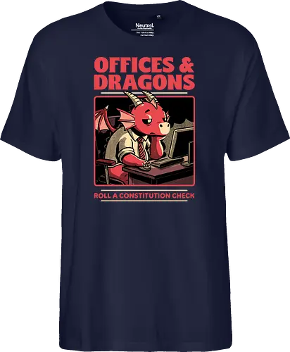 This cool, funny, and awesome t-shirt is perfect for those who love RPG, fantasy, adventure, and mythical creatures, are burned out and hate working. Featuring tired dragon working in the computer with the quote "Office & Dragons - roll a constitution check", in vintage book cover illustration style.