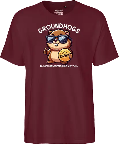 A cartoon groundhog wearing sunglasses holds a badge labeled "Expert" under the word "GROUNDHOGS." Below, text reads, "The only meteorologists we trust."