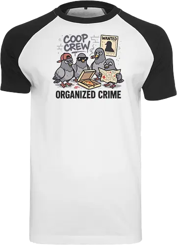 A group of pigeons, labeled as the "Coop Crew," is depicted engaging in activities suggestive of a heist, complete with a pizza box and a map. One pigeon wears a cap, another smokes, while a "WANTED" poster hangs in the background above the text "Organized Crime."