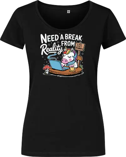 A whimsical unicorn sits at a desk with a laptop and a steaming mug, surrounded by a toadstool and plants. Above the unicorn, the text reads "Need a Break from Reality," with a sign saying "Life is not a Rainbow."