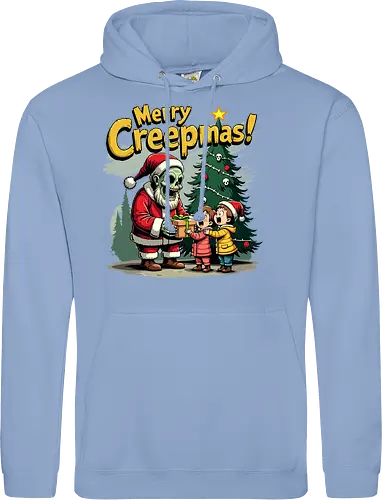 A skeleton dressed as Santa Claus hands a gift to two surprised children in front of a Christmas tree, accompanied by the text "Merry Creepmas!" in a playful font. The scene blends traditional holiday imagery with a humorous, spooky twist.