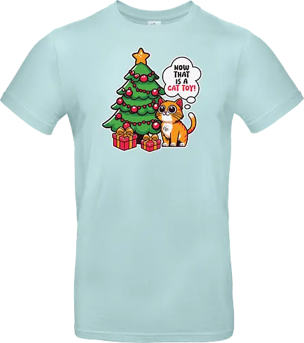 A cute orange cat with wide eyes sits next to a decorated Christmas tree with a speech bubble saying, "Now that is a cat toy!" Colorful presents with bows are placed under the tree, enhancing the festive atmosphere.