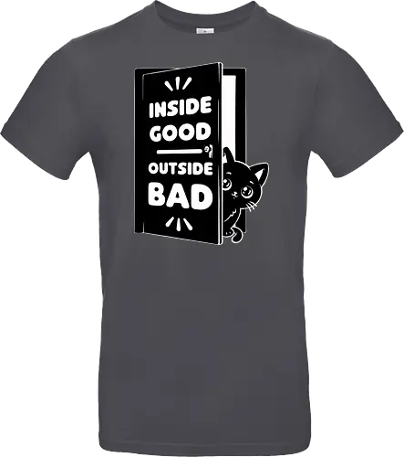 This cute, funny, and awesome t-shirt is perfect for those who love staying inside the house, playing video games, watching TV, and being comfy. Featuring a black cat looking outside the door, with the quote "Inside Good, Outside Bad".