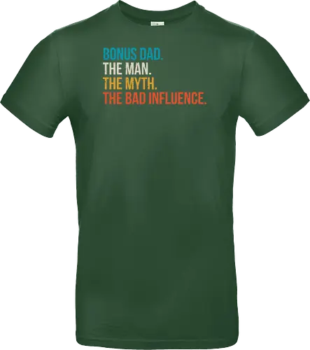 Text humorously describes a stepfather with phrases like "The Man," "The Myth," and "The Bad Influence," in various colors. The layout highlights each section with a different hue, creating a playful and eye-catching design.