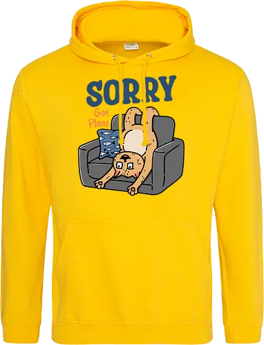 A chill cat lounging on a sofa with the caption “Sorry, got plans.”